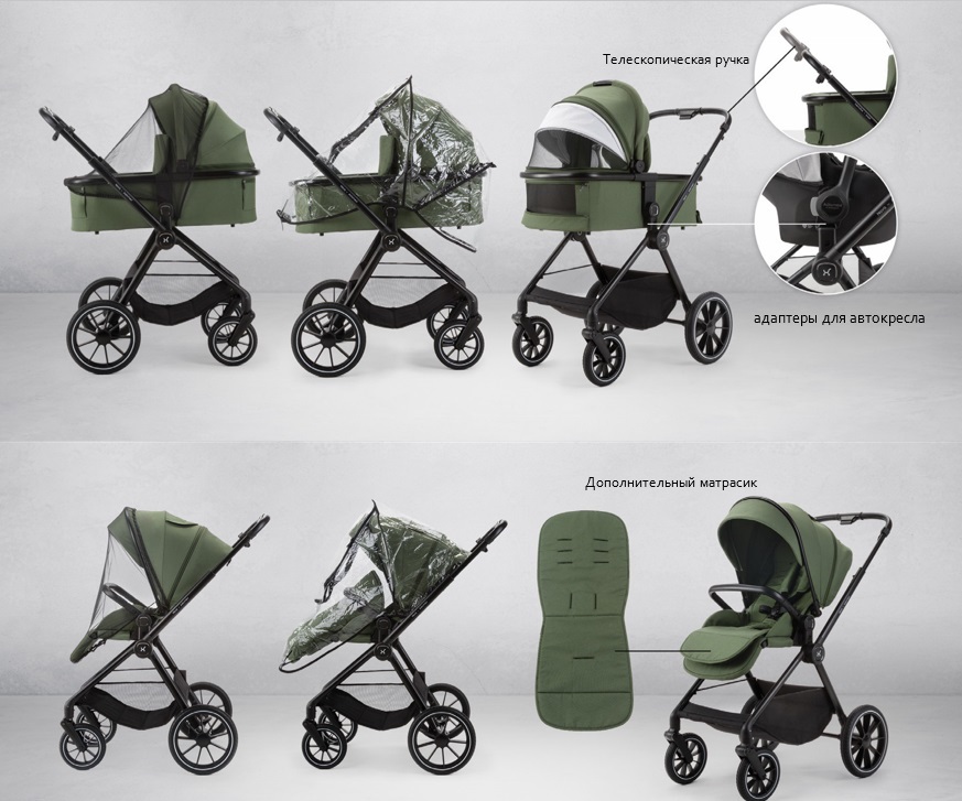 В люльке над головой и в ножках предусмотрены вентиляционные окна и удобный матрас. Накидка люльки имеет откидной клапан от непогоды, под клапаном расположено смотровое окошко благодаря которому вы можете поддерживать визуальный контакт с ребенком. В комплект входит вместительная сумка с инновационной, очень удобной магнитной застежкой, универсальная противомоскитная сетка и универсальный дождевик (для люльки и прогулочного блока). Люлька складывается, таким образом Вы сэкономите место в багажнике на время путешествий.