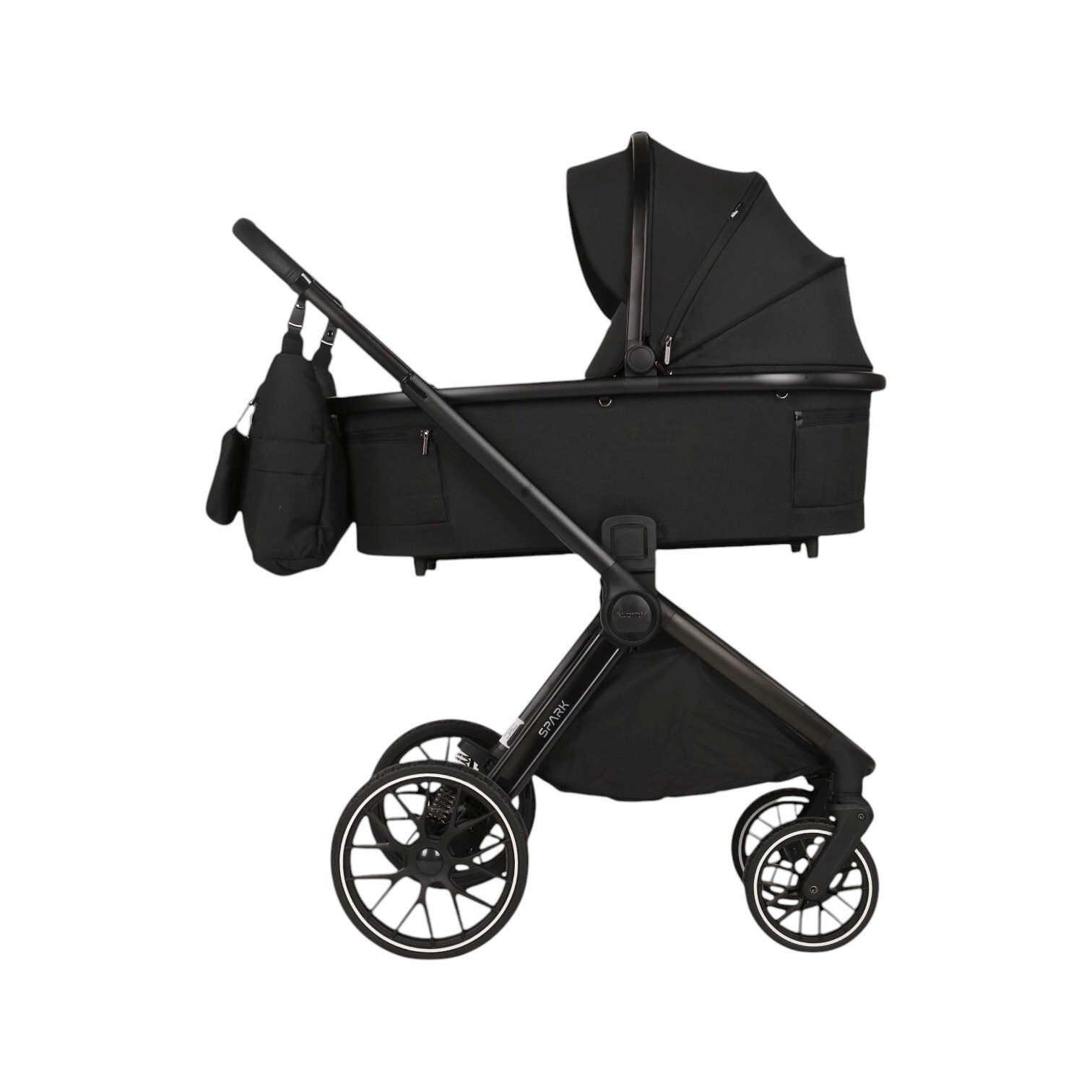 Капюшон люльки оснащен дополнительным сегментом на молнии и вентиляционным сегментом из москитной сеткой. Козырек капюшона имеет дополнительный сегмент для большей защиты от солнца. В передней и задней части люльки расположены вентиляционные окна, а в люльке толстый, удобный матрасик. Откидной клапан на накидке защищает ребёнка от неблагоприятных погодных условий, а смотровое окошко под клапанам помогает поддерживать визуальный контакт с ребёнком. В комплект коляски входит вместительная сумка с инновационной, очень удобной магнитной застежкой, а также сумочка для мелочей, которую вы можете прикрепить к боковой части люльки, и универсальные противомоскитная сетка и дождевик. Мягкая люлька складывается, что помогает экономить место в багажнике в путешествиях.