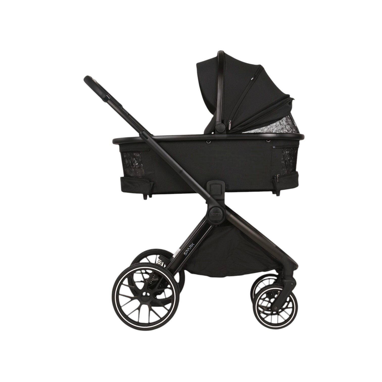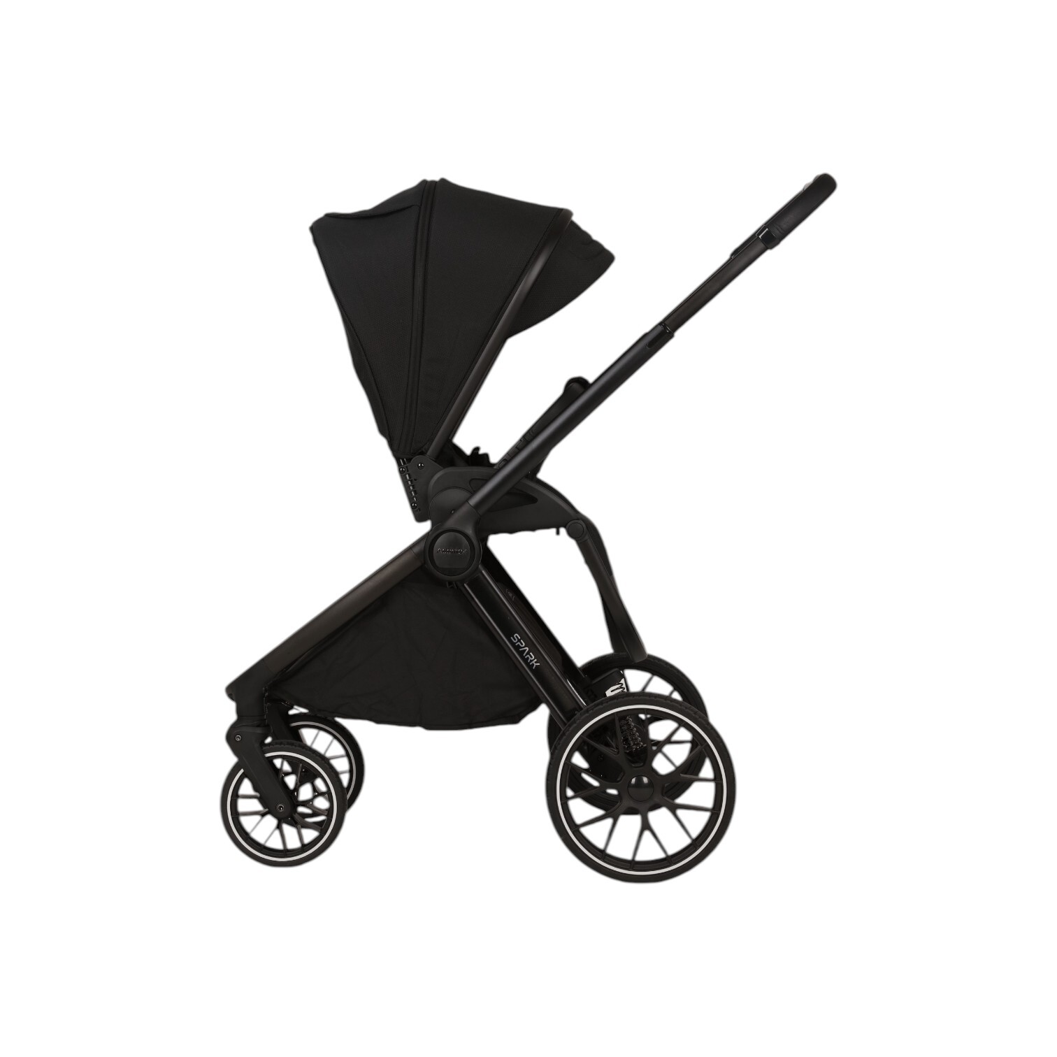 В капюшоне прогулочного блока расположено вентиляционное окно с москитной сеткой и дополнительный сегмент на молнии. Спинка прогулочного блока регулируется в 3-х положениях. Барьерка (поручень) прогулочного блока откидной с поворотными механизмами, а подножка имеет 3-и уровня регуляции. Сиденье оснащено 5-точечными ремнями безопасности с магнитной пряжкой и мягкими накладками, а также удобным мягким матрасом. Прогулочный блок может быть установлен в обоих направлениях движения, а также шасси (раму) можно сложить вместе с прогулочным блоком вне зависимости от направления его установки. В коляске SPARK имеются в комплекте стандартные (более низкие) и дополнительные адаптеры, которые обеспечивают удобство использования независимо от роста родителей.